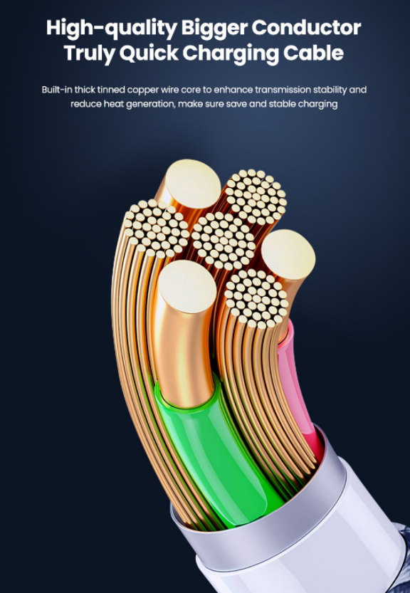 Lõi đồng đặc nguyên chất. Hỗ trợ truyền dữ liệu tốc độ cao, sạc nhanh lên đến 3A (15W) tăng tốc 30% so với sạc thường.