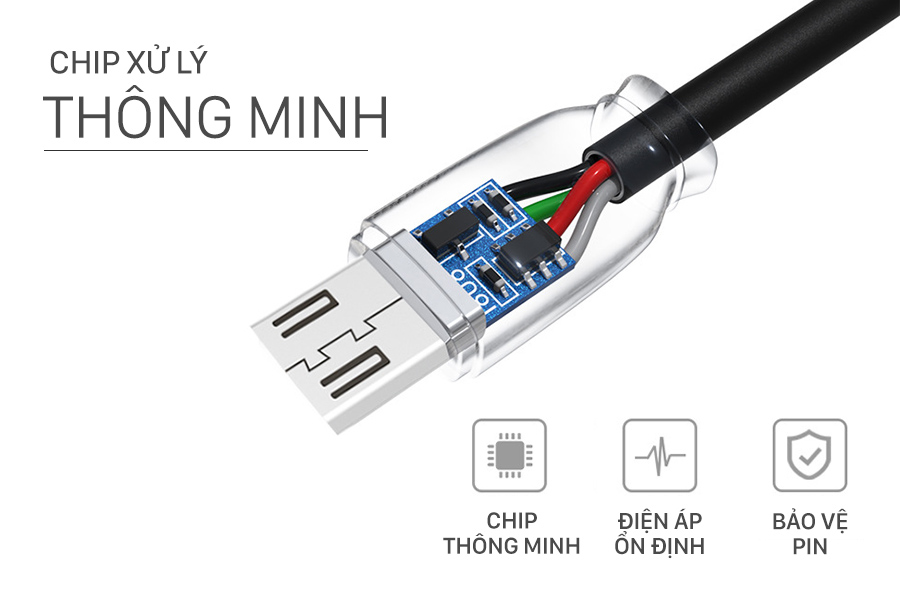 Chip xử lý thông minh duy trì điện áp ổn định, bảo vệ pin, tốc độ sạc tối đa 2,1A, tốc độ truyền tải dữ liệu 480Mb/s.